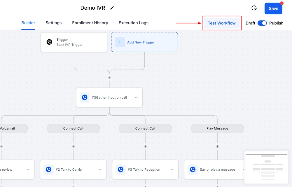Testing ensures your workflow functions as intended before it goes live. Click the Test Workflow button at the top-right corner of the page. Select the contact you’d like to test the workflow on. Run the test to simulate how the workflow will operate in a real scenario.