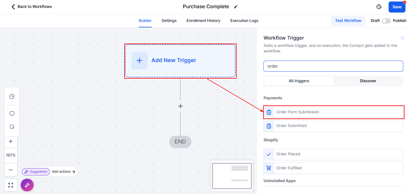 After setting up your workflow, the next step involves specifying what triggers it and what actions follow. Add a new workflow trigger by selecting 'order form submission'. Filter this by the funnel or website containing the form.
