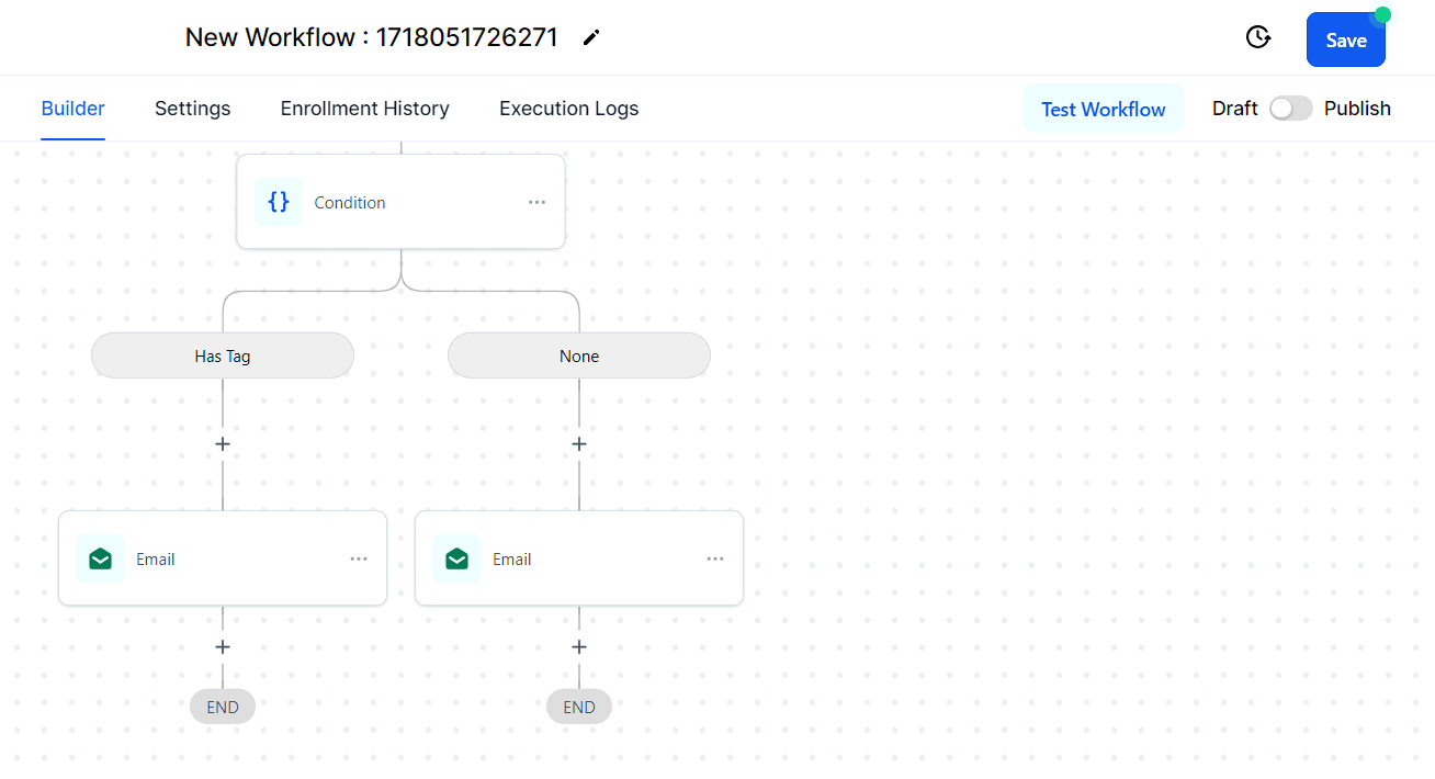 Conditions: Criteria that determine the path a workflow follows. For example, if a contact is tagged as a "new lead," they might receive a different set of emails compared to a “returning customer.”