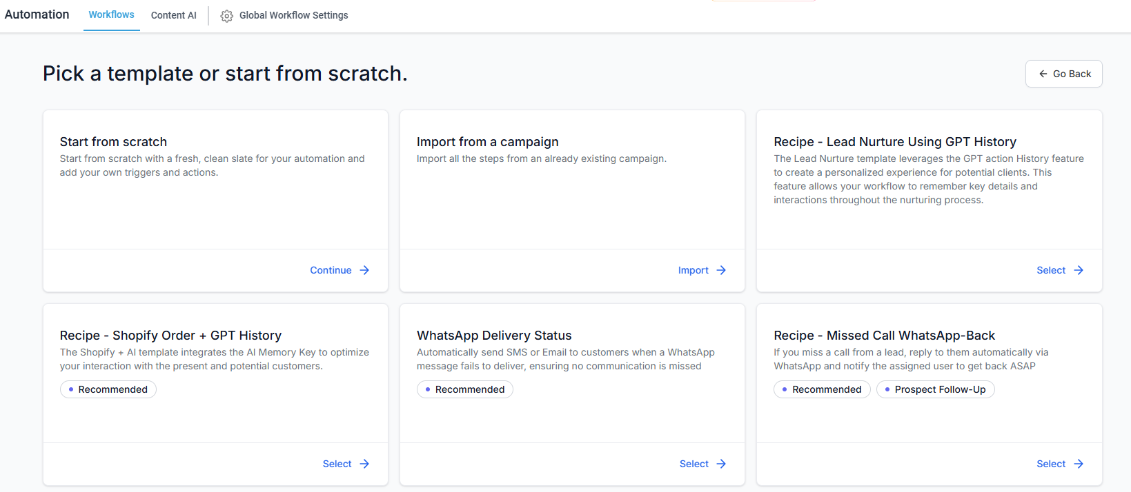 Choose between starting your workflow from scratch, importing an existing campaign, or using prebuilt templates.