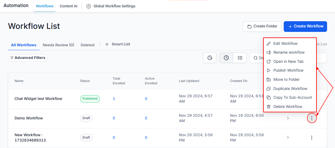 Actions Menu: A dropdown menu that lets you edit, rename, move to a folder, duplicate, or delete the workflow, offering flexibility for managing each process.