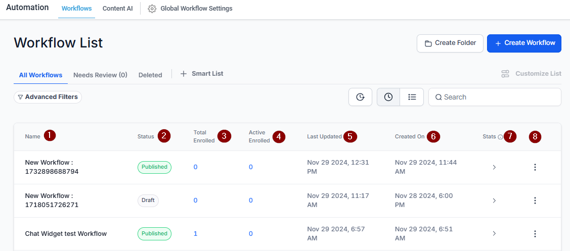 Name: Displays the title of each workflow, helping you identify them at a glance.