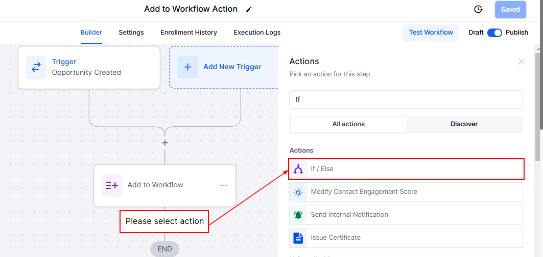 Click on the “+” symbol to search and add the If/Else action to your workflow.