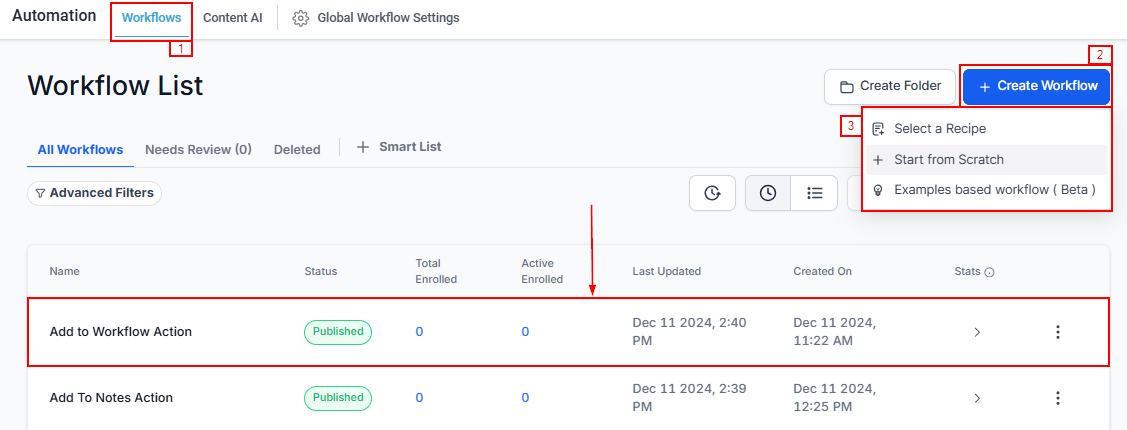 Navigate to the Automation tab from the left navigation menu, then select Workflows > +Create Workflows. Begin a new workflow from scratch or opt to use a pre-existing template for quicker setup.