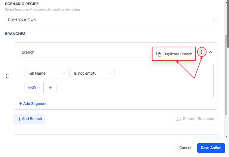 After setting your conditions, click on the three dots menu to find the “Duplicate Branch” option. The duplicated branch will appear next to the original, allowing for easy modification and customization.