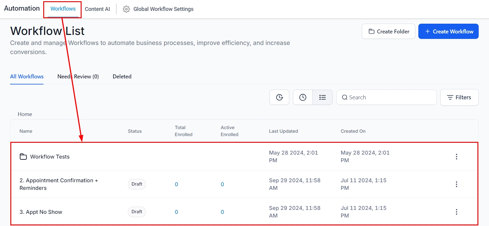 From the Automation > Workflows section in your account, select the workflow you wish to modify.