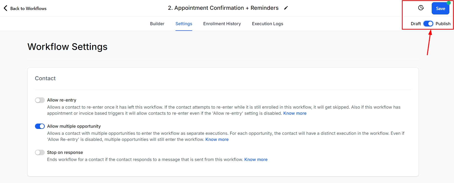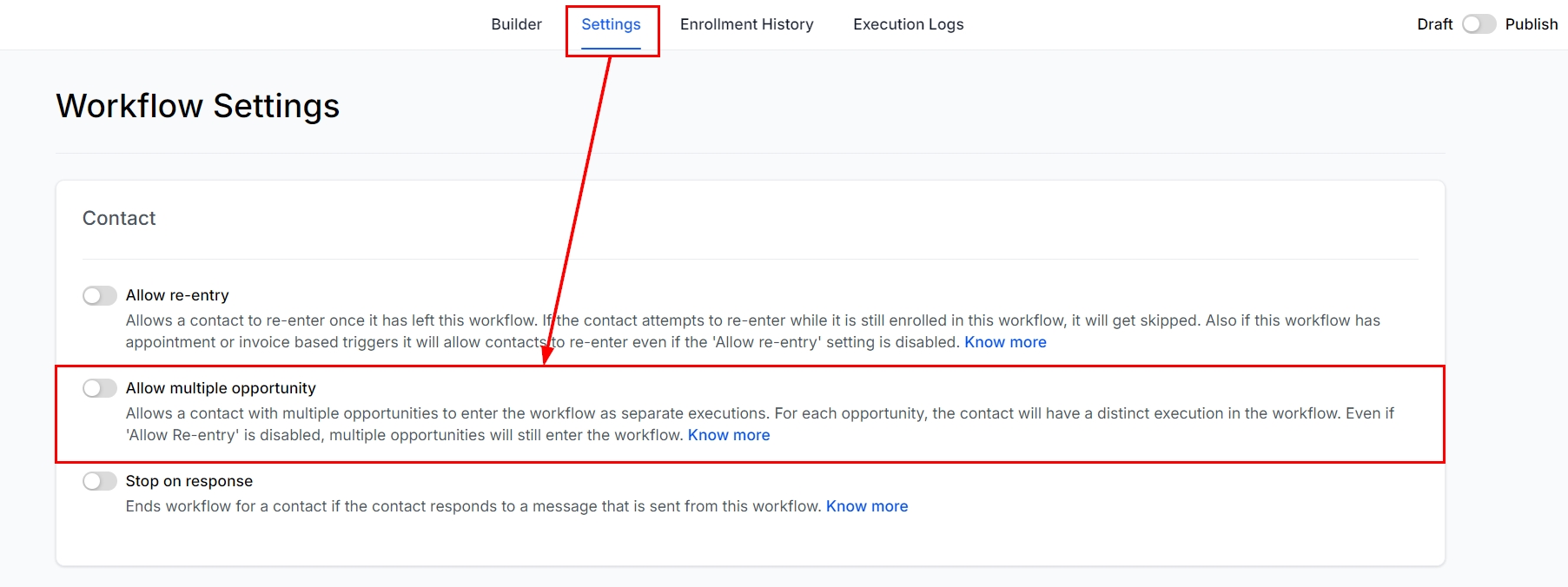 Open the workflow settings. At the top of the settings page, you will find the "Allow Multiple Opportunities" Toggle.