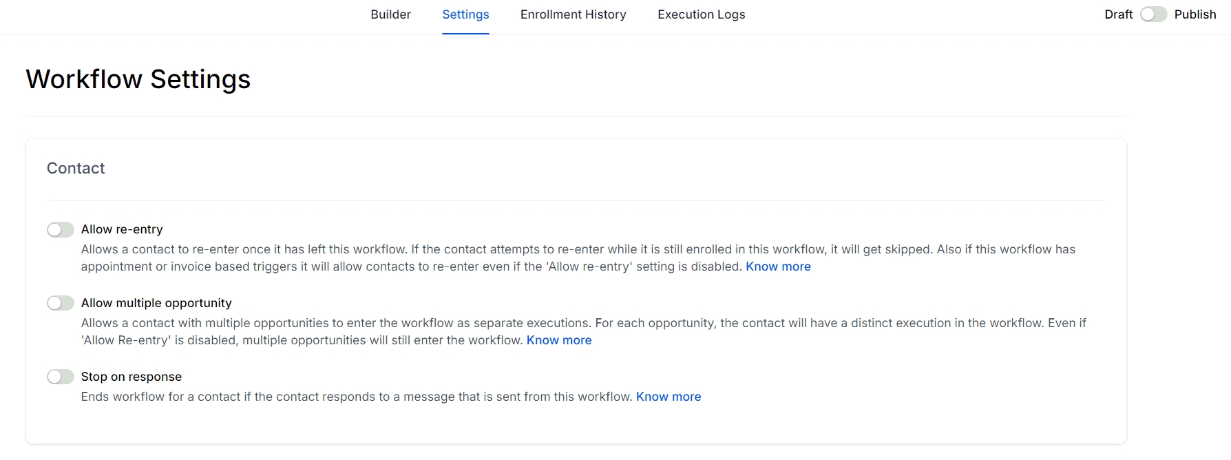Workflows created before this feature's release will have the toggle turned off by default. Newly created workflows will have it enabled automatically, similar to how the re-entry feature functions.