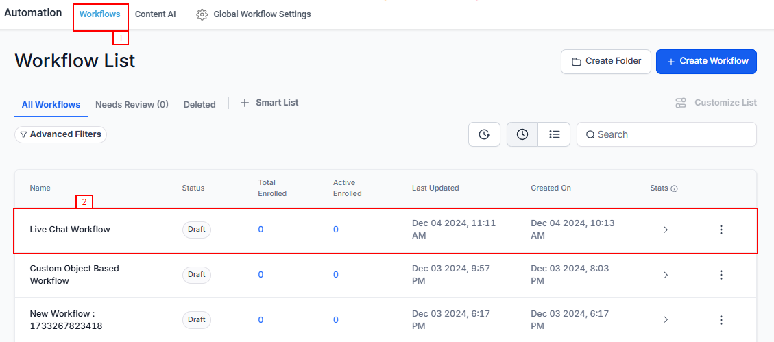 To get started, navigate to the Automation section of your CRM, in the Workflows tab select the specific workflow you wish to edit.
