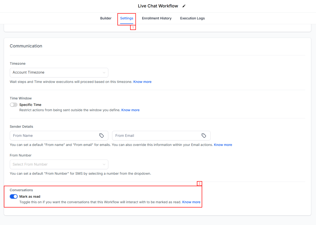 To locate the "Mark as Read" option open the workflow's Settings tab, scroll to the Conversations section, and find the toggle for "Mark as Read."