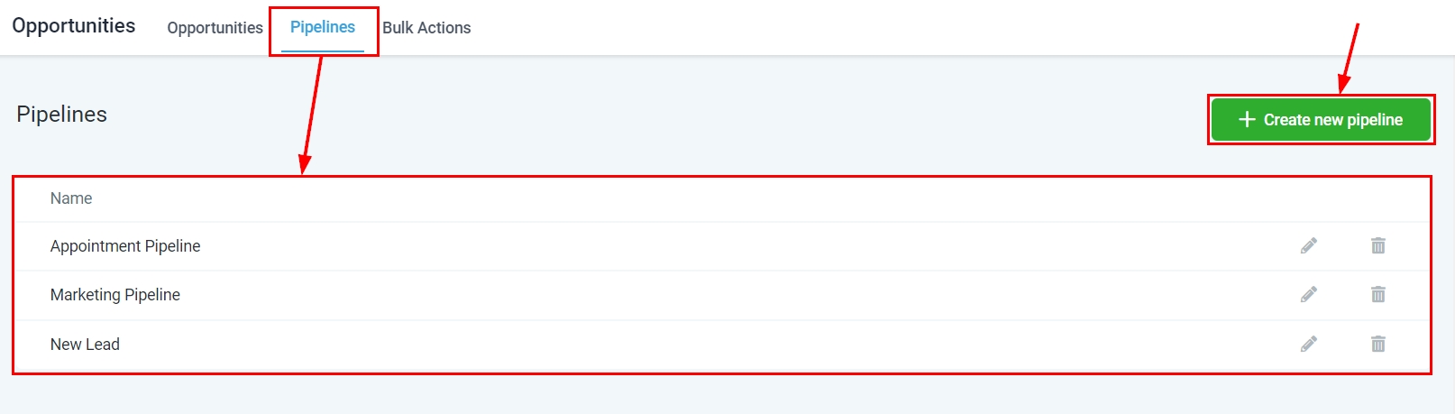 Before linking form submissions to create opportunities, make sure your sales pipeline is ready by verifying that you have an existing pipeline within the "Opportunities" section within your platform. If not, create one and define its stages.