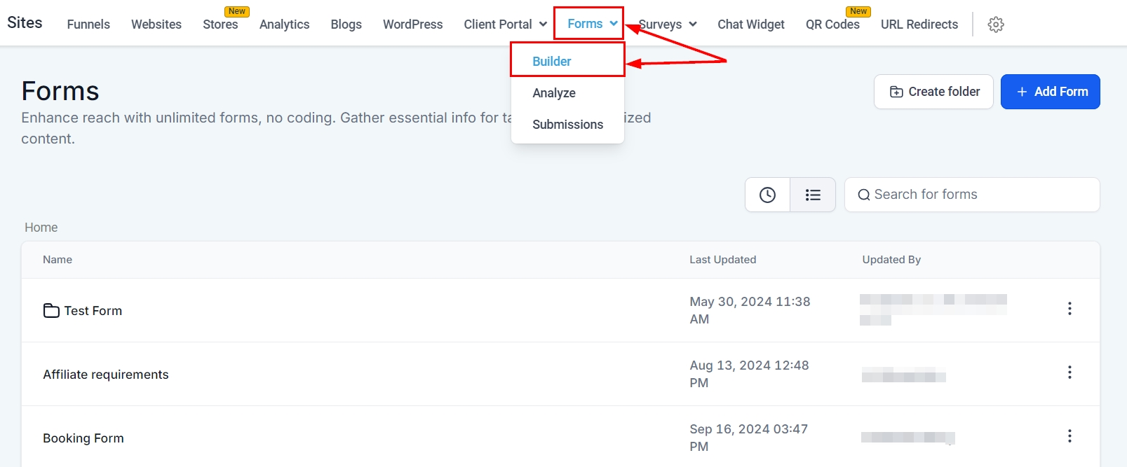 Go to the "Sites" section and select "Builder" from the Forms dropdown. Identify the form you want to use for capturing leads or create a new form if needed.