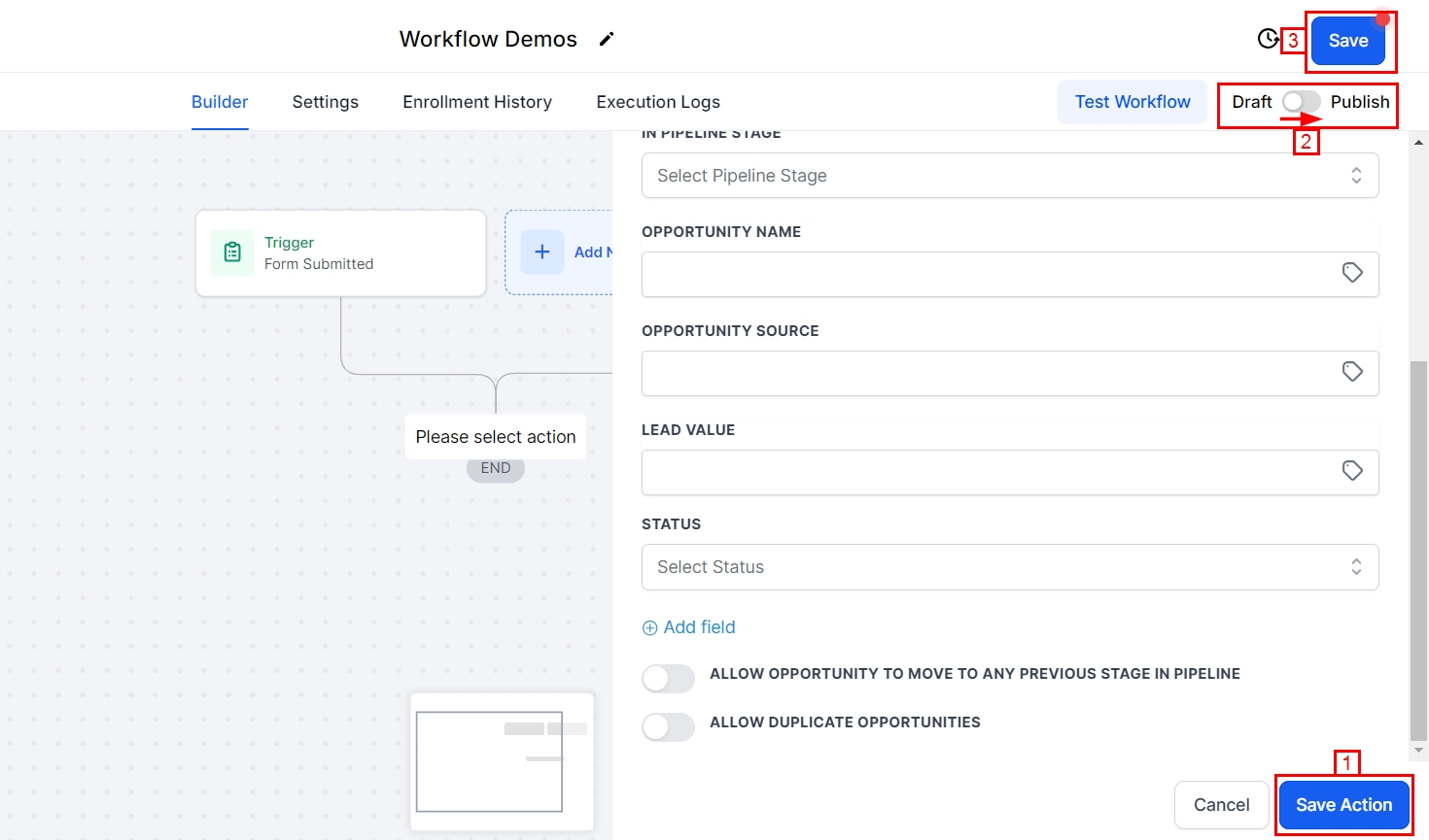 The CRM allows you to control whether duplicate opportunities are created. Adjust this setting based on your preference in the workflow action settings.