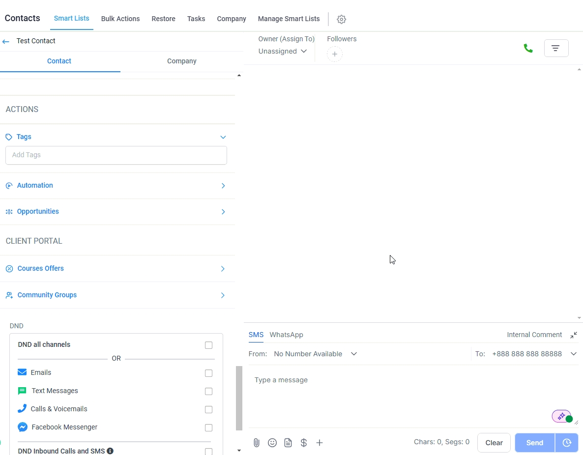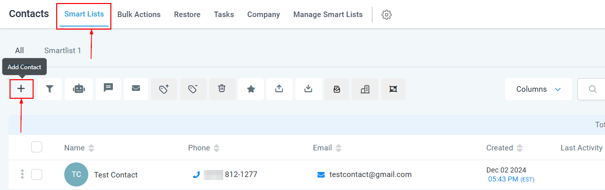 To get started, navigate to the 'Contacts' section of the CRM, under the Smart Lists tab click on the “+” icon to create a new contact entry for yourself, including any relevant details that your workflow will utilize (e.g., name, phone number).