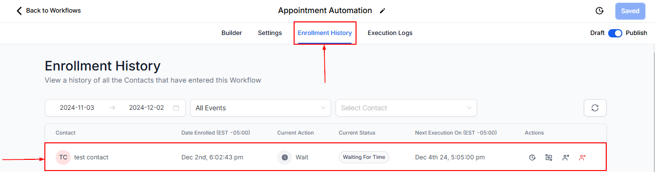 If the workflow triggers and actions are firing properly in the Enrollment history tab, you will find the test contact you added to this particular workflow.