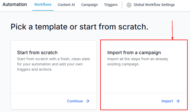 In the "Import from a Campaign" option, click on Import. This will allow you to choose an existing campaign that you wish to integrate into a new workflow.