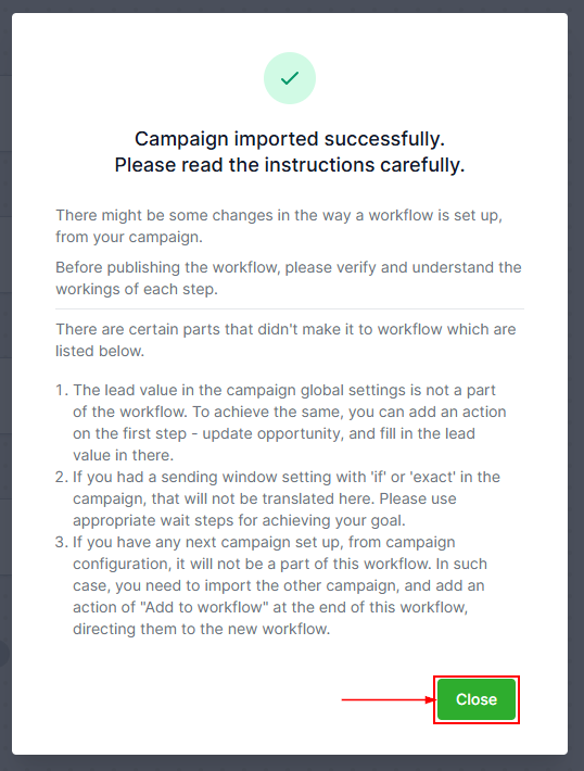 A message will appear in the Workflow builder confirming the successful import of your campaign. Close this message to proceed with customizations.
