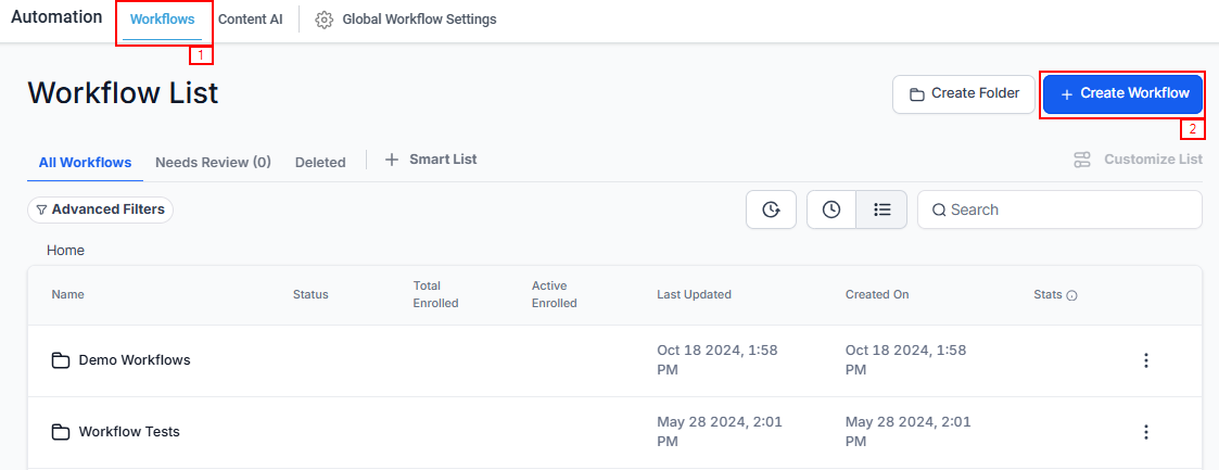 To get started, navigate to the Automation section, in the Workflows tab click on the "+Create Workflow" button.