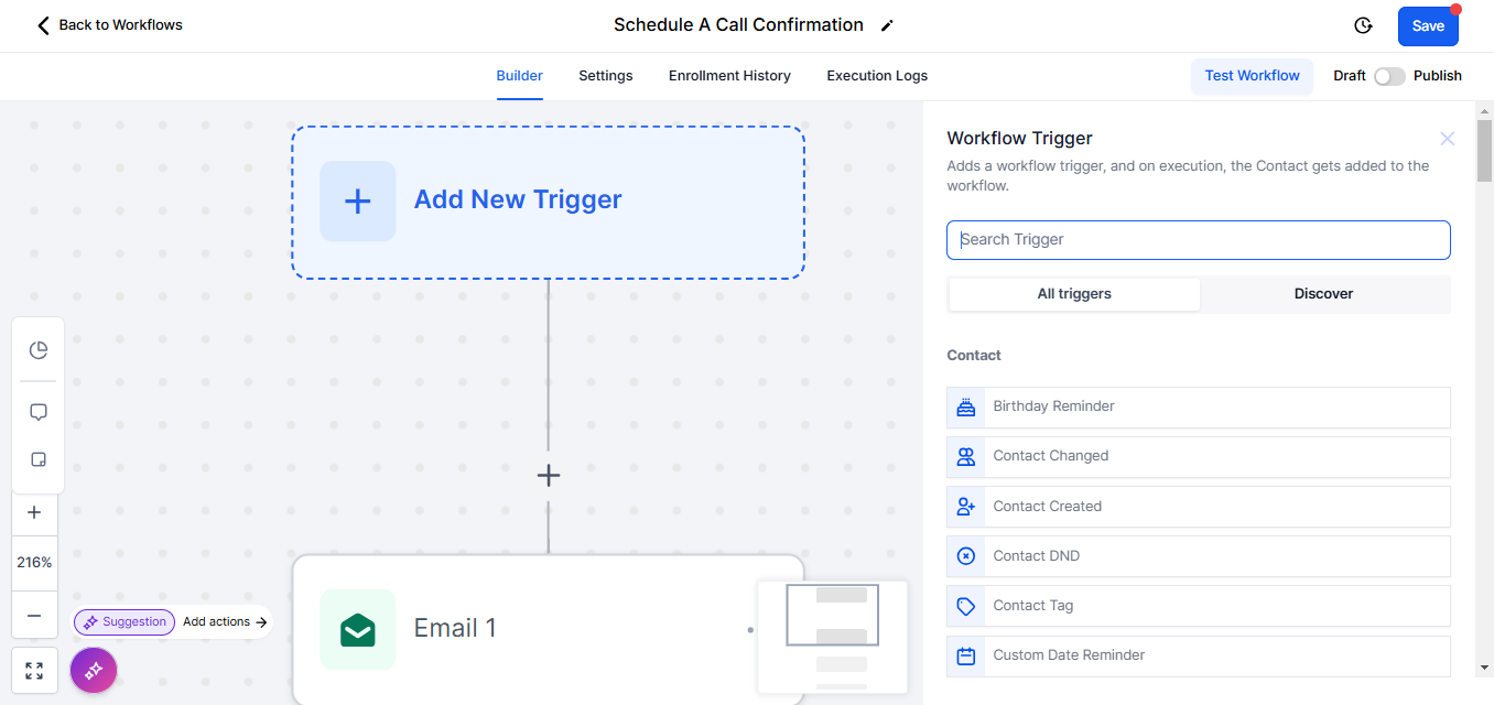 At this stage, you can add or modify triggers, paths, and actions within the workflow to tailor it to your business requirements. The flexibility of the Workflow builder allows for extensive customization to automate your processes.