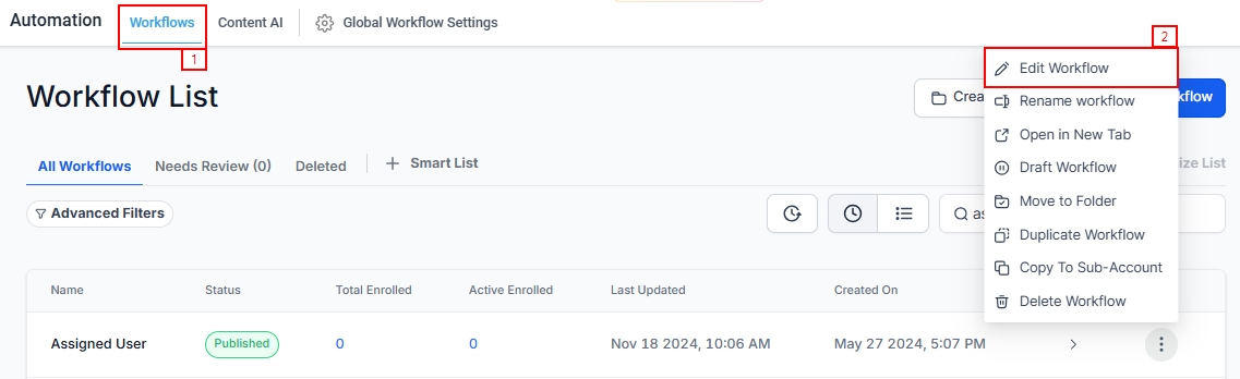 Navigate to the Workflow Builder in the Automation tab and select the workflow you wish to modify.