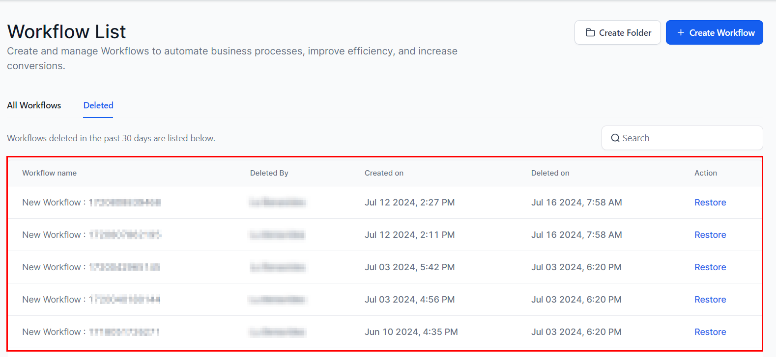 3. Review the list of deleted workflows to identify the one you wish to restore.