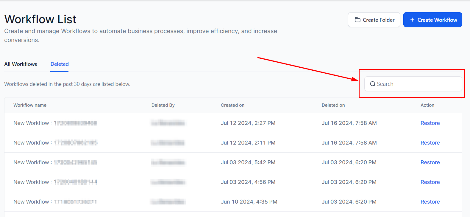2. Access the Deleted Tab by selecting the “Deleted” button. Workflows deleted in the last 30 days will be listed in this tab.