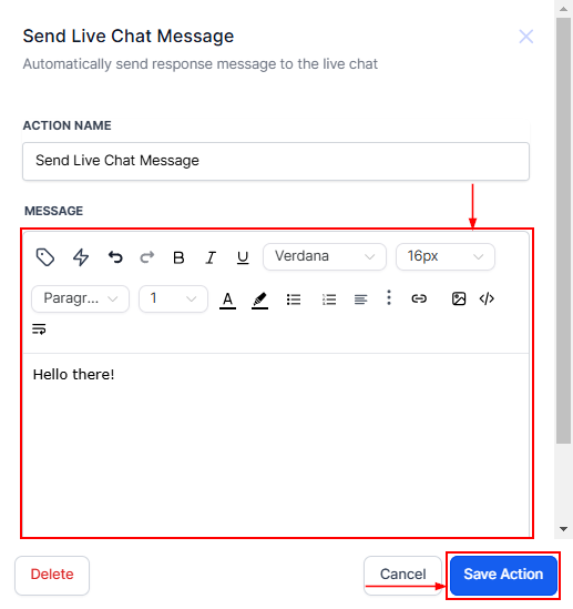 Write your message as you wish with Text, Trigger links, and Custom values that can be sent in the live chat and save your settings.