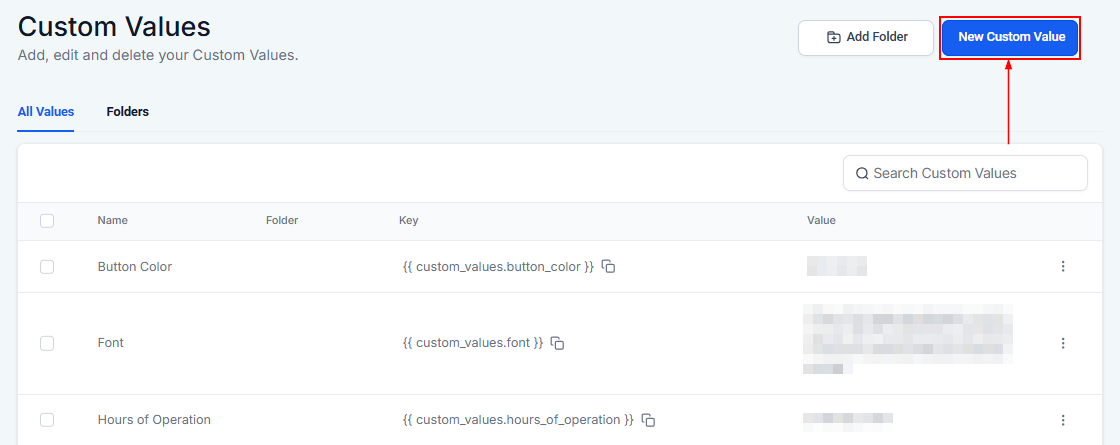 To set up custom values go to your CRM Settings and select “Custom Values.” Define the data you want to automate, such as appointment pages, product links, or survey URLs. Save these values, making them available for use in automation workflows.