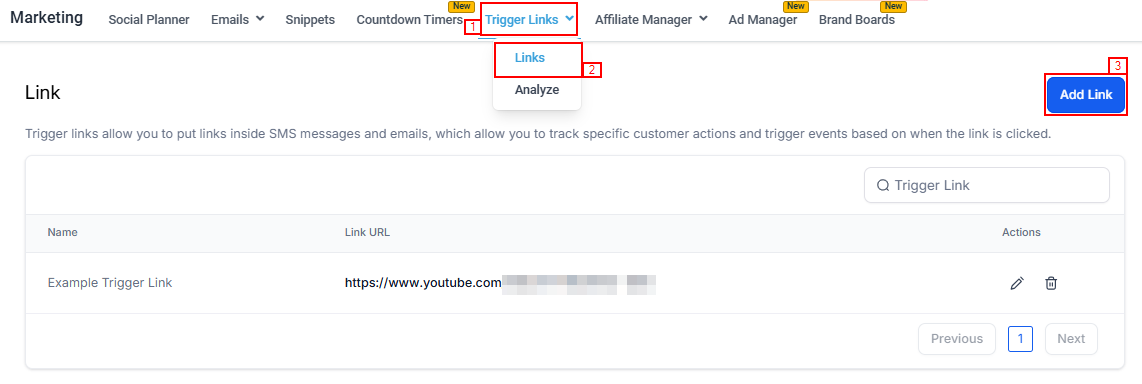 Navigate to the "Marketing" section in your CRM, on the "Trigger Links" dropdown select Links, and click on Add link to create a new trigger link. Assign a name that reflects its purpose, such as “Order Form Follow-Up.” Insert the URL using a custom value, ensuring it dynamically updates for each lead or campaign.