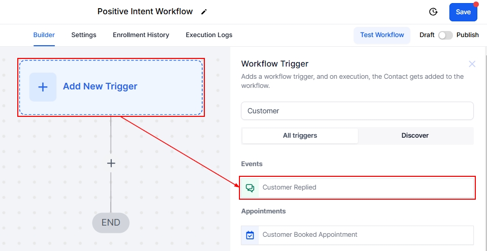 Navigate to the “Workflows” section within the CRM and create a workflow from scratch. Select the “Customer Replied” trigger option.