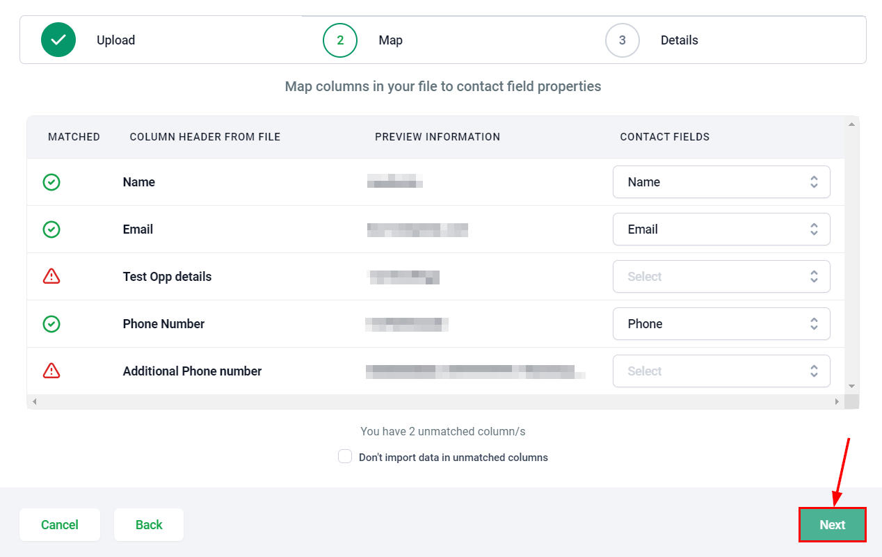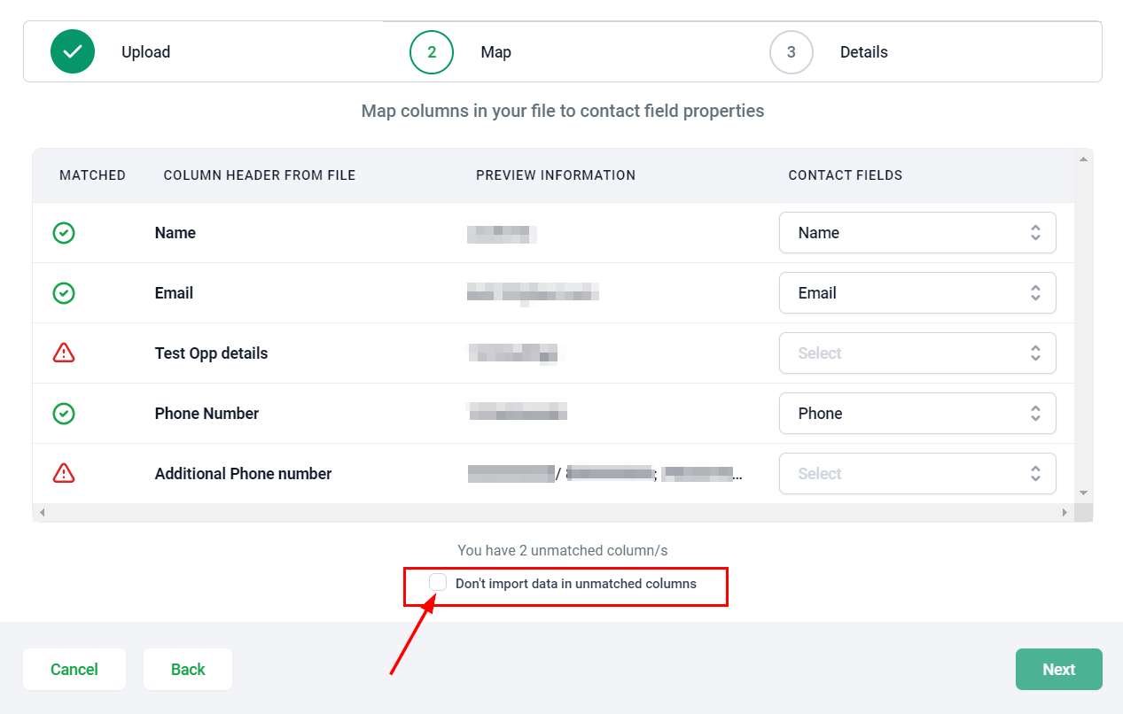 If you prefer not to import data from unmapped columns, select the option located below the table.