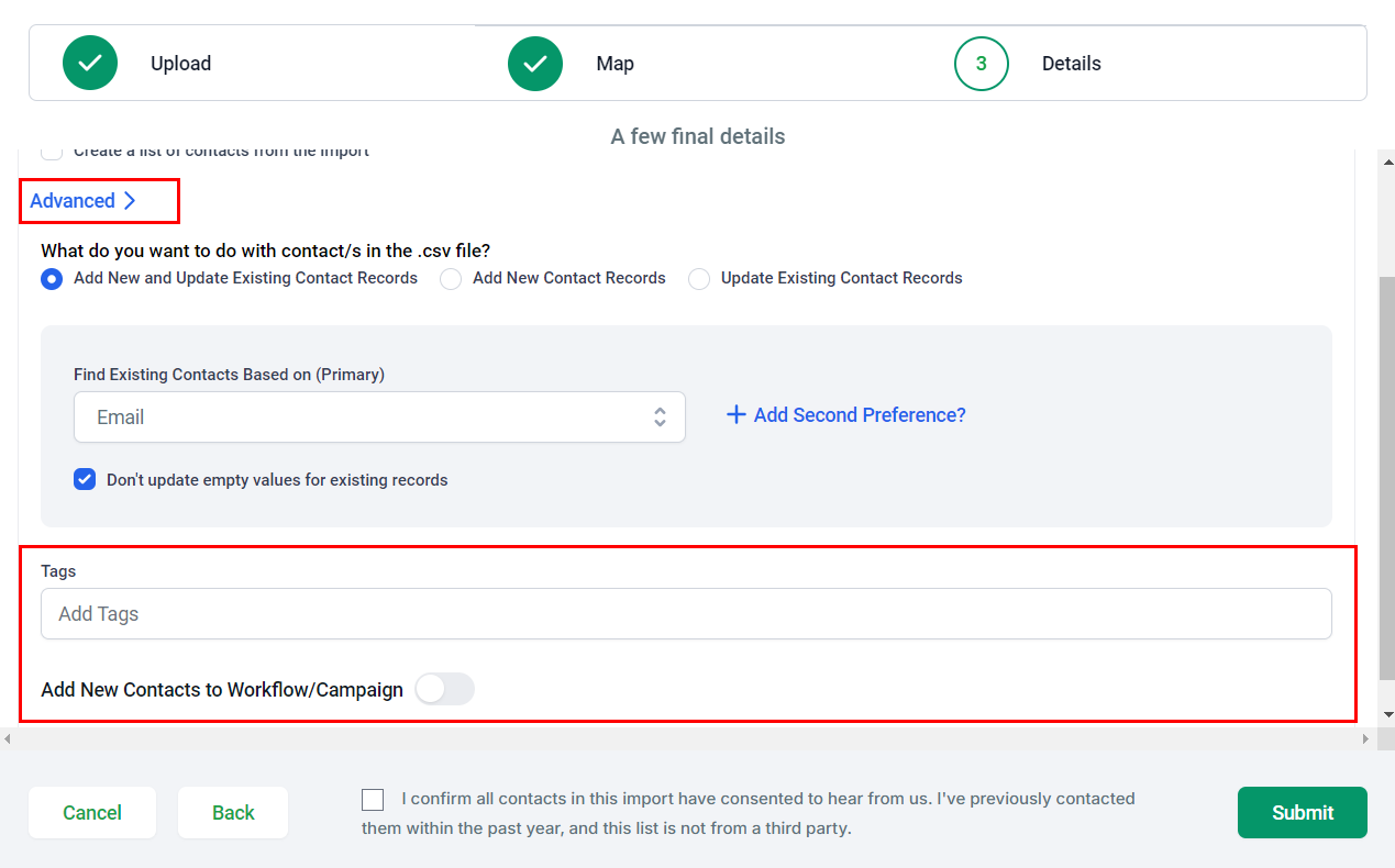 4. In the Details tab, click the Advanced dropdown, add a tag for these leads (optional), toggle on "Add To Workflow/Campaign," and select the Workflow or Campaign to which you'd like to add the leads from the CSV.