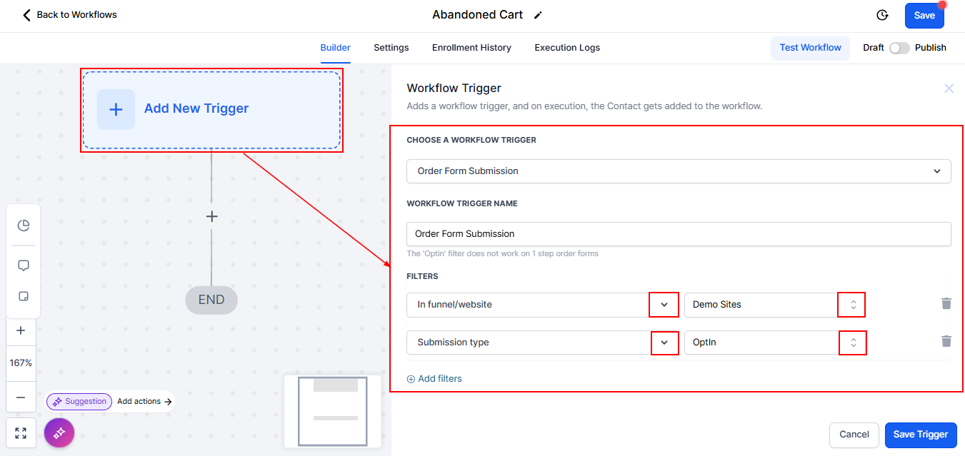 Select "Add New Trigger" and choose "Order Form Submission" as the trigger event. Add a filter to specify the funnel or website where the cart was abandoned. This can be any website or specific funnel you're monitoring. Set the submission type to "Opt-in" to target abandoned checkouts.