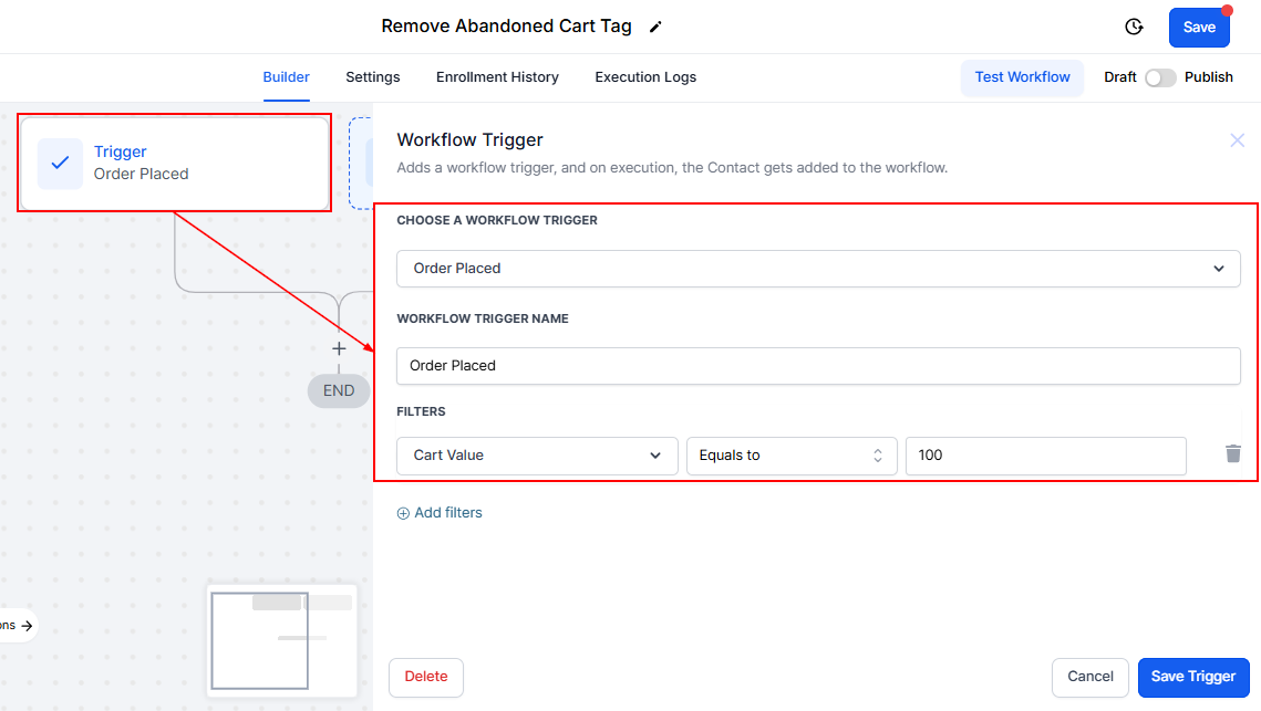 Workflow Not Triggering: Ensure that the trigger conditions are correctly set and that the funnel or website filter matches where the abandoned carts occur.