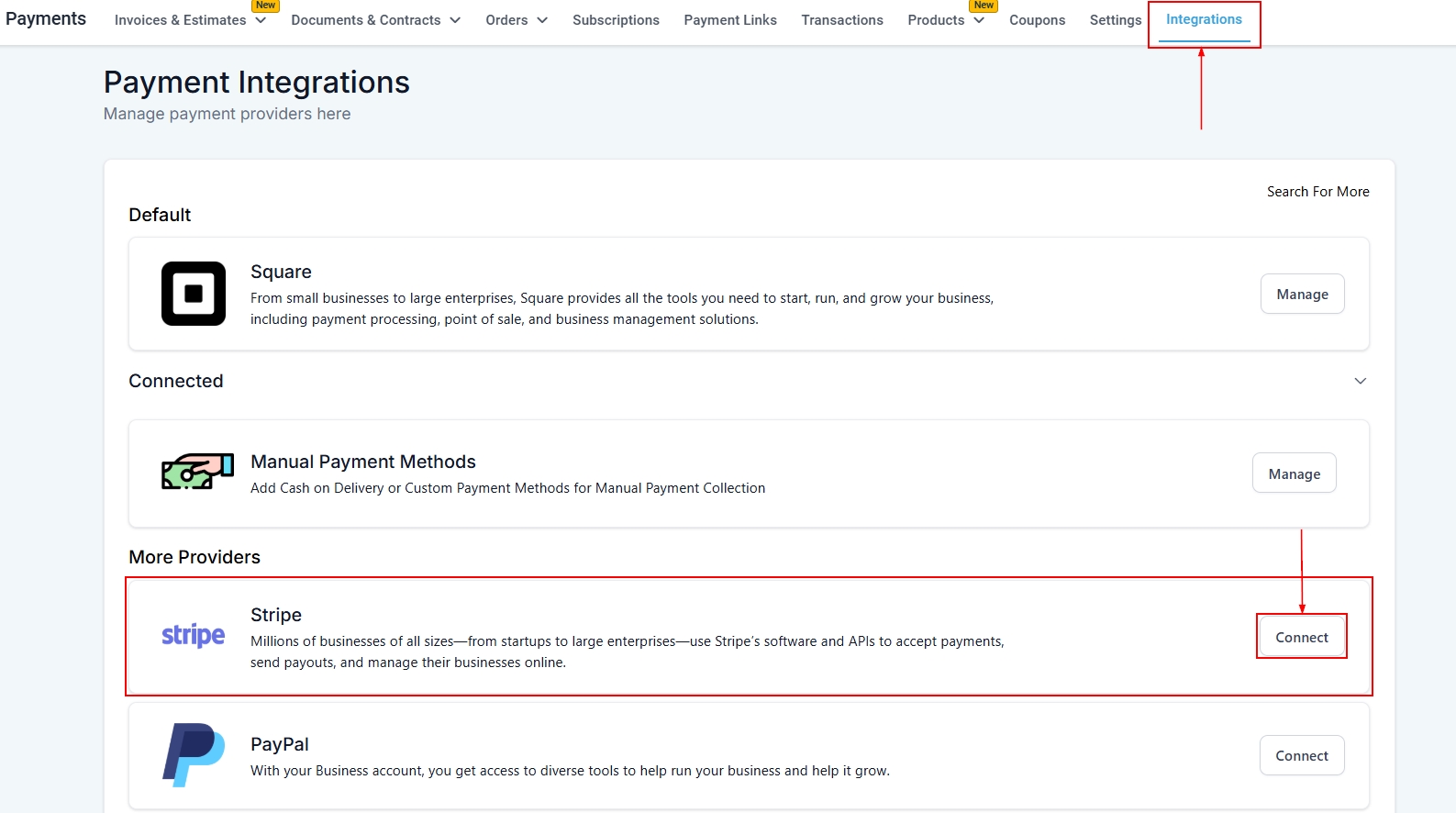 To get started Navigate to Payments > Integrations. In the integrations section select Stripe. Follow the prompts to connect your existing Stripe account to the CRM. This step is essential for the automated payment feature to function.