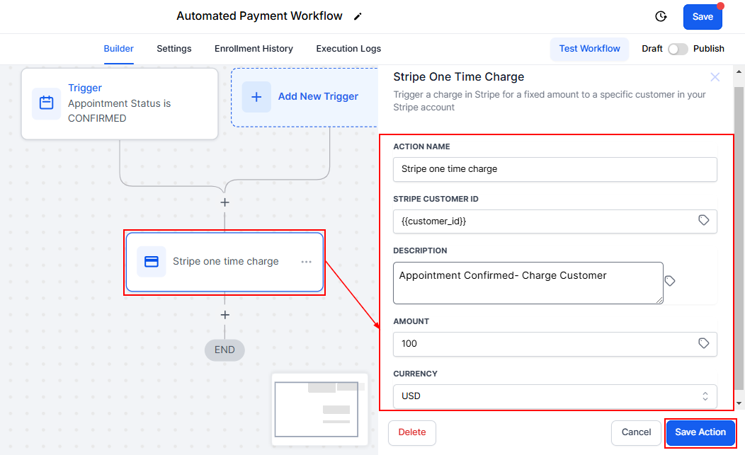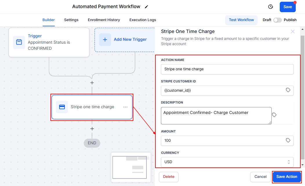 With Stripe integration in place, the next step is to set up automated payment triggers. These triggers allow you to automate billing processes, such as charging for appointments or specific actions within the CRM.