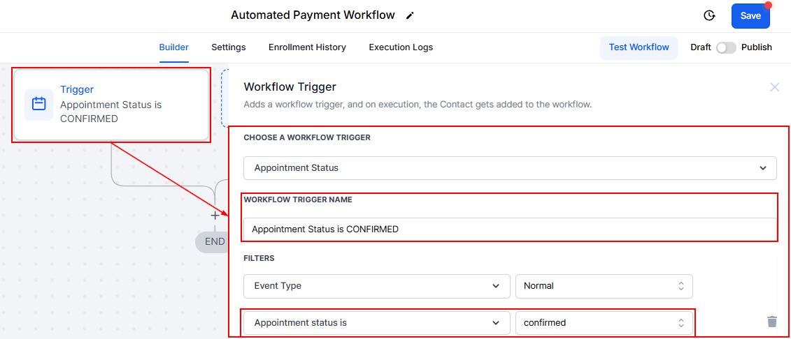 Click on the option to add a trigger. Name it appropriately, for example, "Appointment Status is Confirmed", and set the Filter to Appointment Status is Confirmed. Specify the conditions under which the payment should be triggered. For instance, you can set it to activate when an appointment is Confirmed.