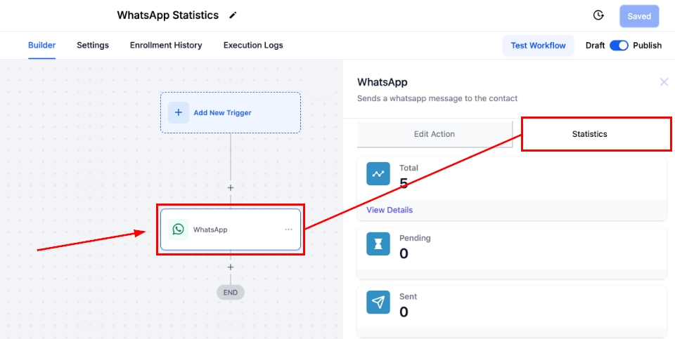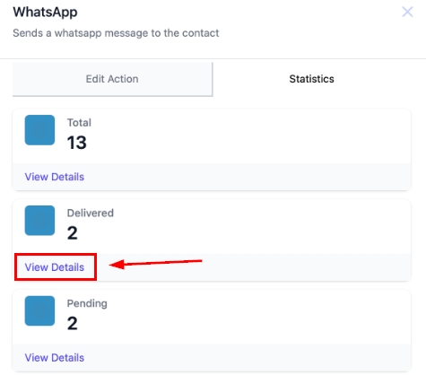 Total: These will show the number of WhatsApp messages triggered by the selected workflow action.