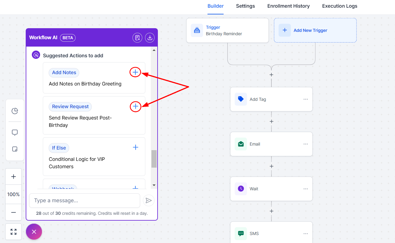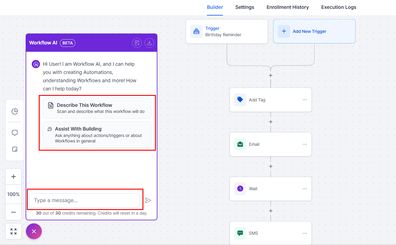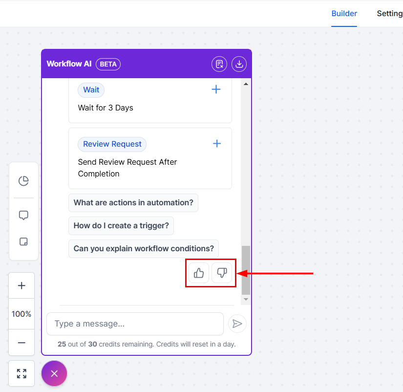 📌 Note: Each day, you’ll have 30 credits to interact with Workflow AI. Each question or action request uses one credit and the credits reset daily.
