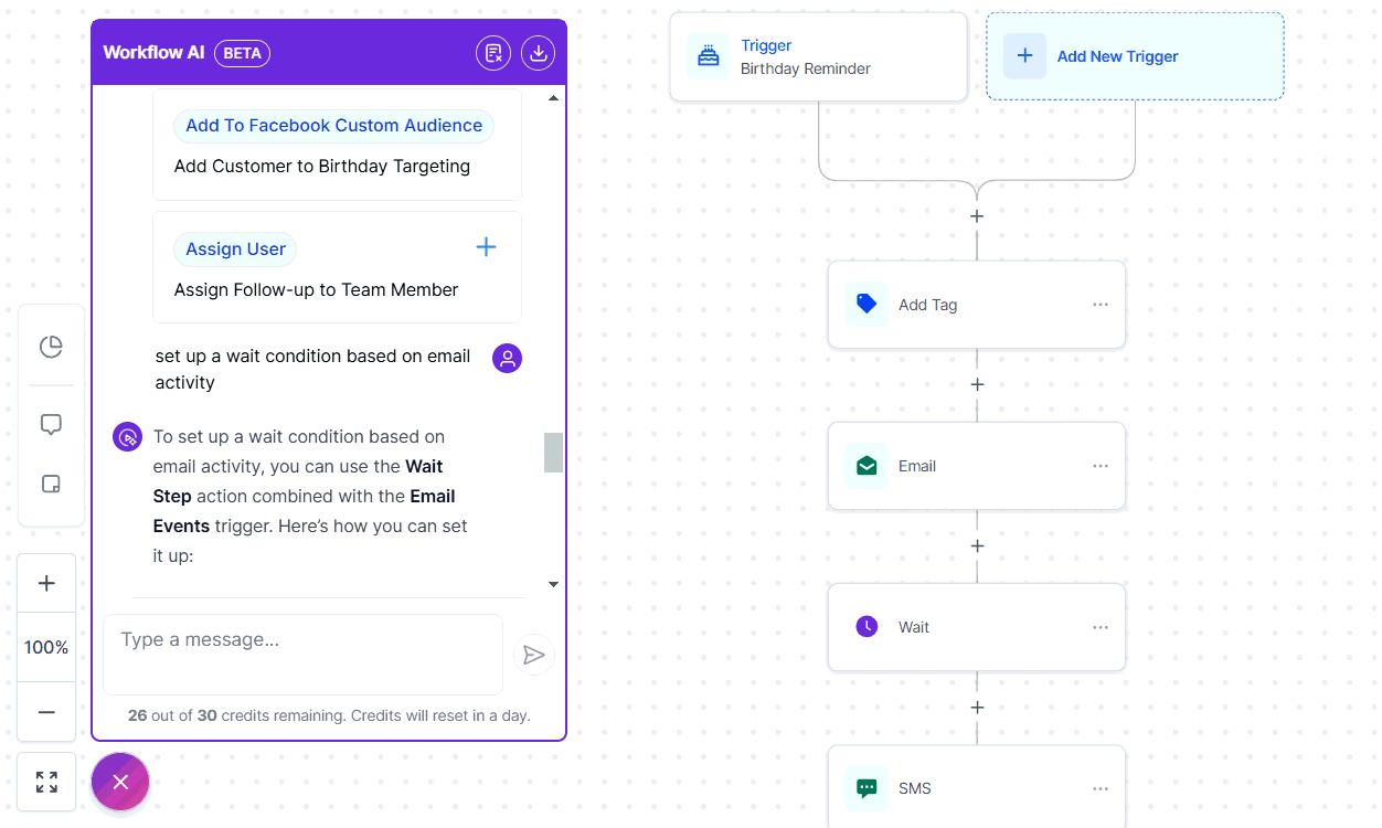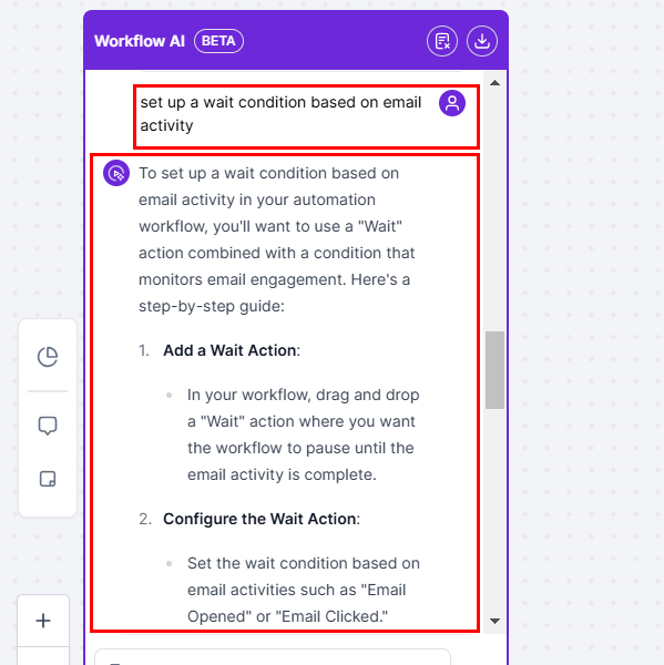 If you’re unsure how to configure a specific action, mention your end goal, and Workflow AI will suggest the necessary steps and provide configuration guidance. For instance, you can ask it to set up a wait condition based on email activity, and it will walk you through each configuration step.