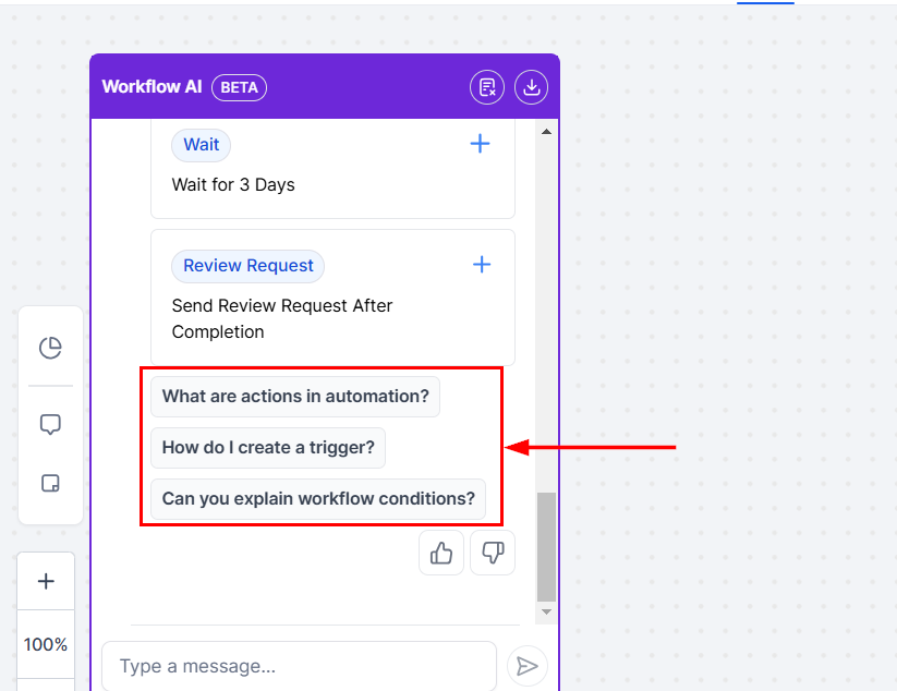Locate the Workflow AI chat icon in the bottom left corner of the workflow builder. Clicking it will open the chat box, where you’ll see several prompt cards to start the conversation.