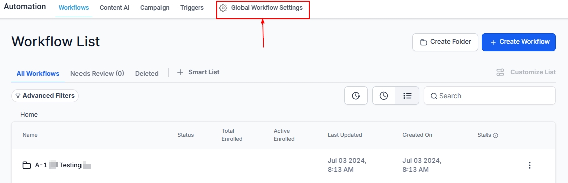 Begin by navigating to the Automation section from your account Dashboard, and then select the Global Workflow Settings tab located on the upper panel. This will direct you to a detailed settings page where you can configure your email notification preferences.