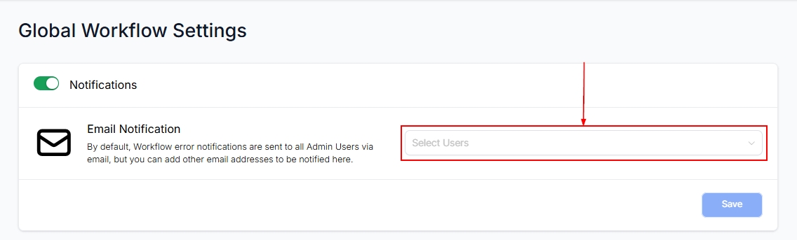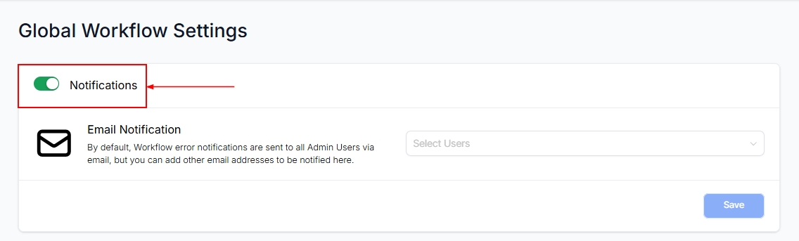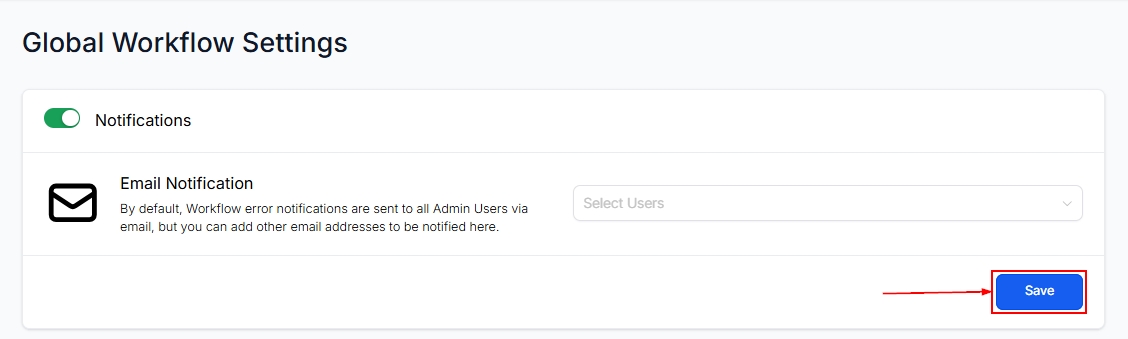Here, you can manage your email notification preferences. By default, this option is toggled "on," ensuring that all account administrators receive immediate email notifications when an error occurs within a workflow. This proactive alert system helps you stay informed of any workflow failures, allowing you to take swift action to maintain a consistent and reliable customer experience.