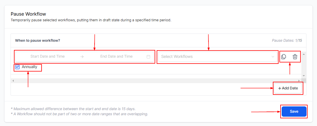 In Global Workflow Settings, scroll down to Pause Workflow, choose the Start Date and End Date for the period you want the workflows paused, and then select the workflows you wish to pause from the list. You can choose "All Published Workflows" or individual workflows as needed. Tick the "Annually" checkbox if you want the workflows to pause on these dates every year. Use the Clone or Delete icons to duplicate or remove date ranges as needed. Click the Save button to apply the changes.