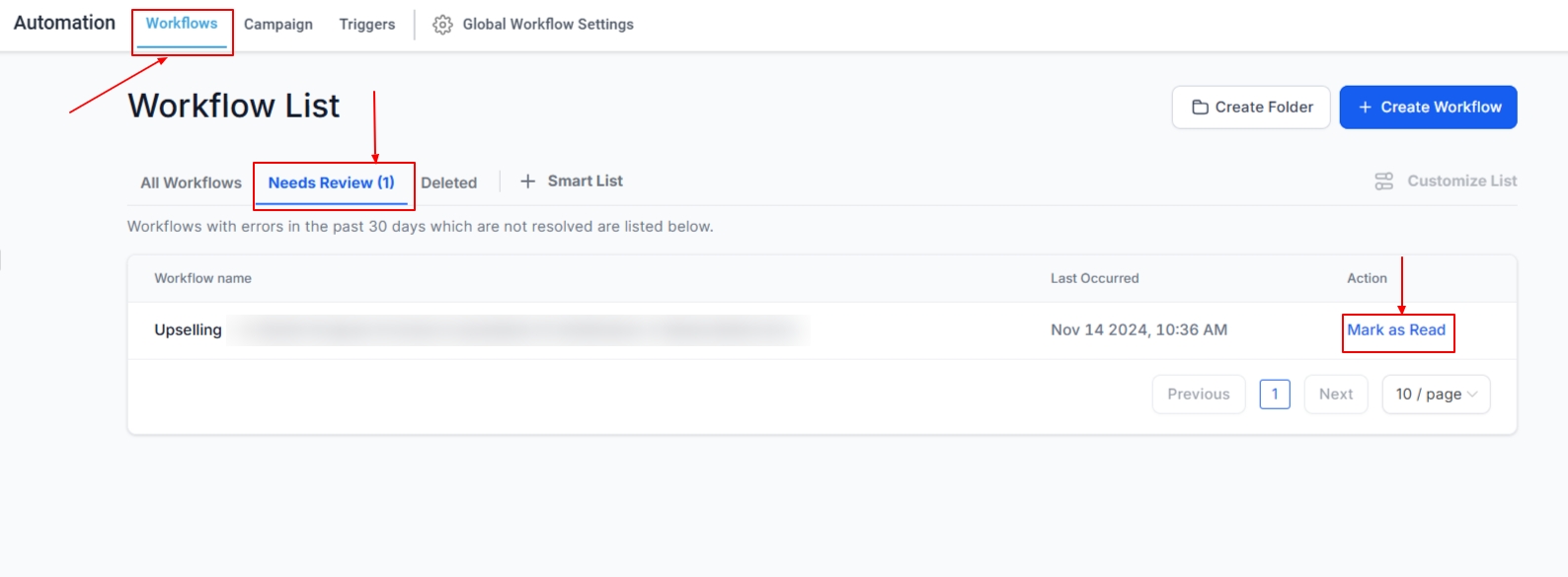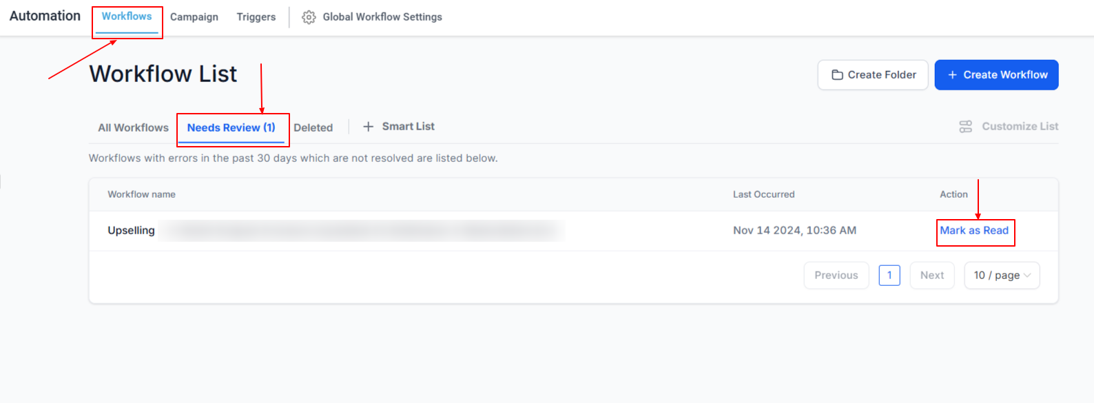 If any errors are detected in your workflows, they will be displayed in the Workflow Needs Review tab. To acknowledge these errors, mark them as read.