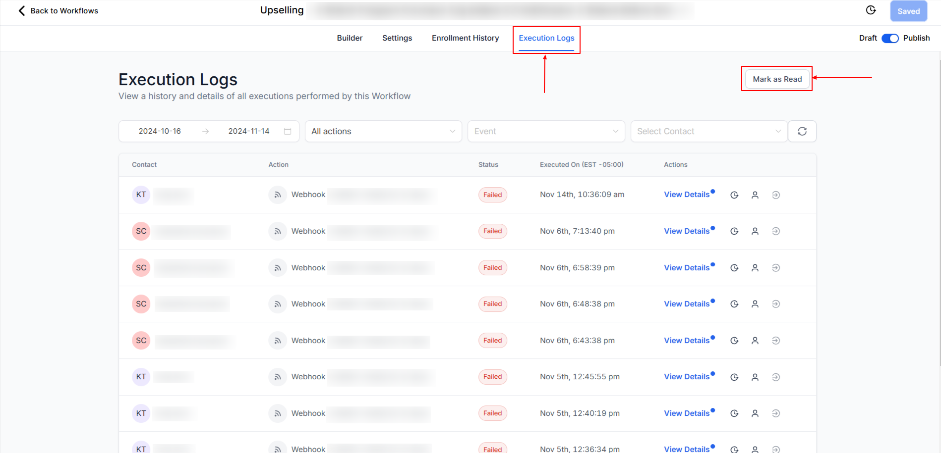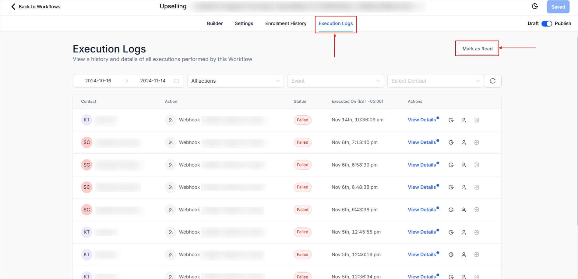 To view the details of the errors, click on the Workflow Name. This action will redirect you to the Execution logs, where you can examine the specific errors within the workflow. Once reviewed, ensure you mark the errors as read to indicate that they have been addressed.