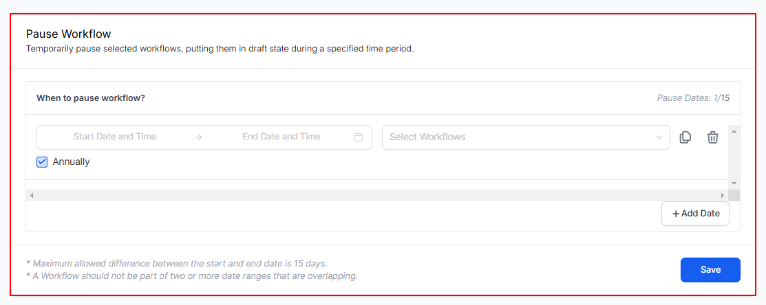 The Pause Workflow feature allows you to temporarily stop specific workflows, or all workflows, within a chosen date range. You can also set date ranges to repeat annually, automatically pausing the selected workflows on these dates every year.