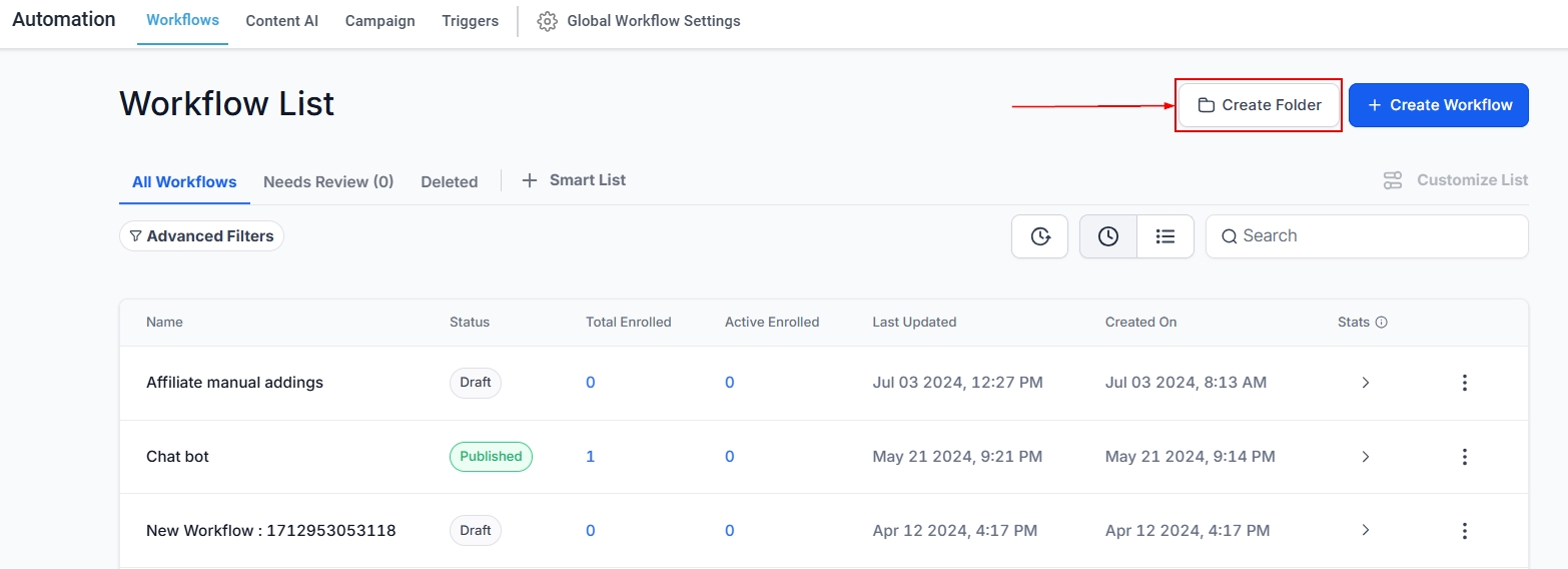 To keep your workflows organized, start by creating folders. Click the Create Folder button, give your folder a name, and click Create. Your new folder will appear in the workflow list for easy access and organization.