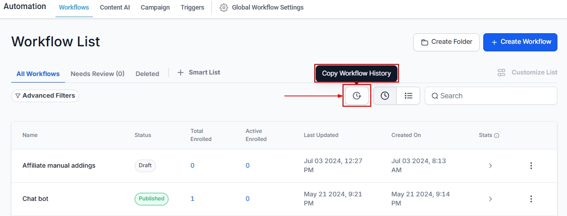 Here you can access and copy past workflow histories for reference or re-use, ensuring consistency in actions that have worked for you in the past.