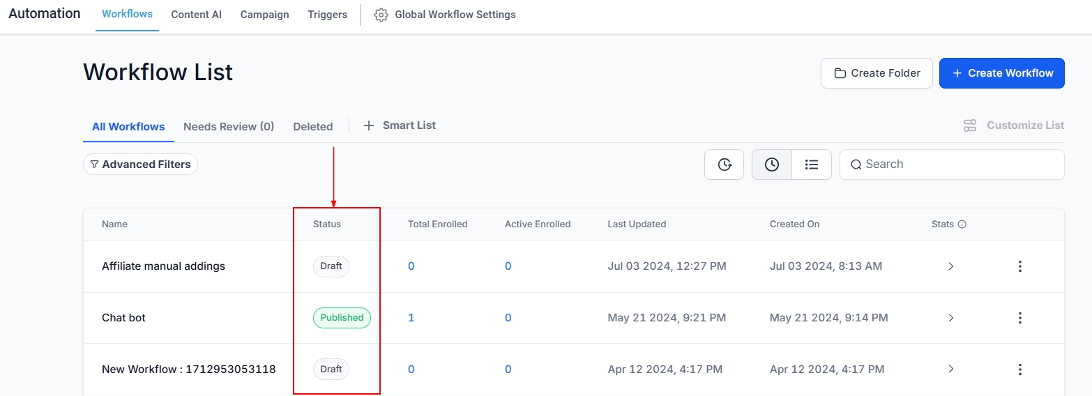 The All Workflows section serves as your homepage within the Workflow area, showing all workflows created by you and your team. Here, you can view, edit, or create new workflows.